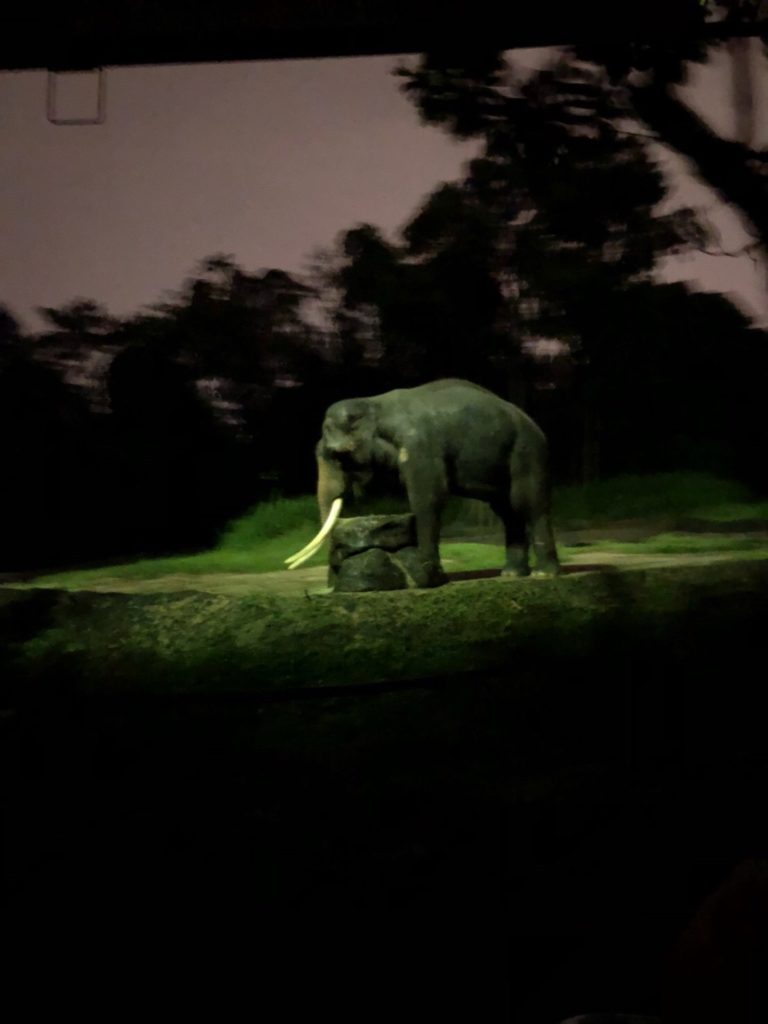 暗い中、ライトに照らされる動物たちはすごく幻想的でした。ゾウさんの他にも、フラミンゴなども見ることができました。